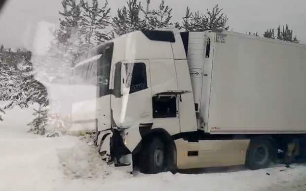 Авария произошла в субботу, 17 февраля, на трассе Москва-Касимов. Судя по кадрам, большегруз съехал с дороги и въехал в кучу снега.
