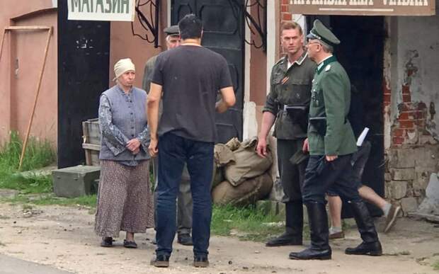 Судя по снимкам, город играет роль оккупированной территории: в кадр попали вывески на русском языке и военные в немецкой форме. Также на площадку привезли ретро-автомобиль.
