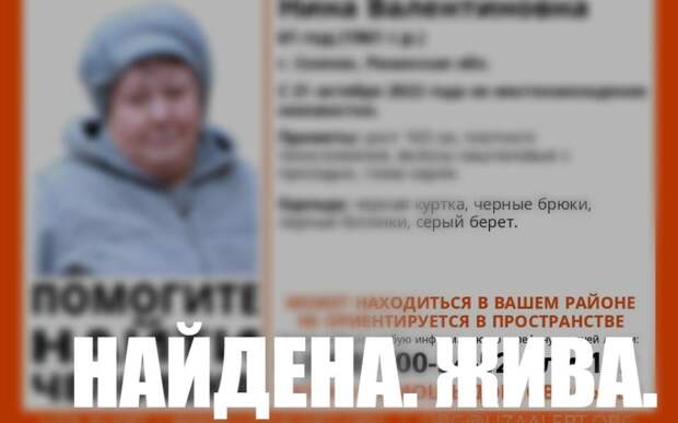 Местонахождение женщины не было известно с 21 октября. Она пропала в Скопине. Утром 22 октября стало известно, что женщину нашли живой.