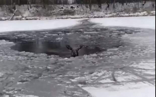 Мужчины во время рыбалки заметили животное, которое провалилось под лёд. Рязанцы 4 часа ломали и пилили лёд, чтобы лосиха смогла выбраться.