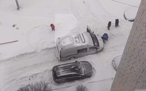 Спецмашина застряла между домом №4з и военными домами. Автор пишет, что с начала зимы данный проезд ни разу не чистили.