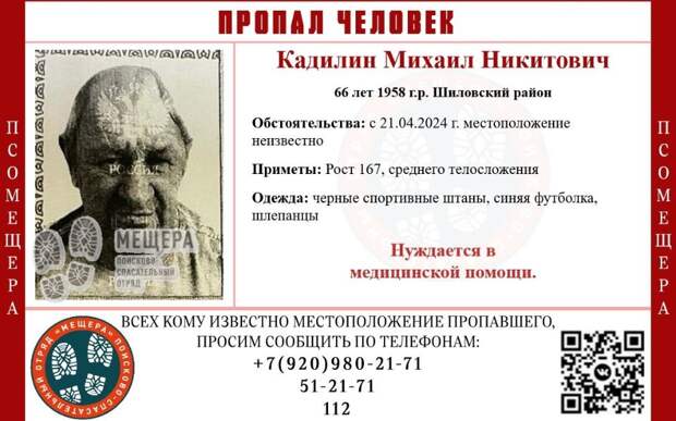 Информацию о пропавшем просят сообщать по телефонам 112 или +7 (920) 980 21 71, а также 51-21-71.