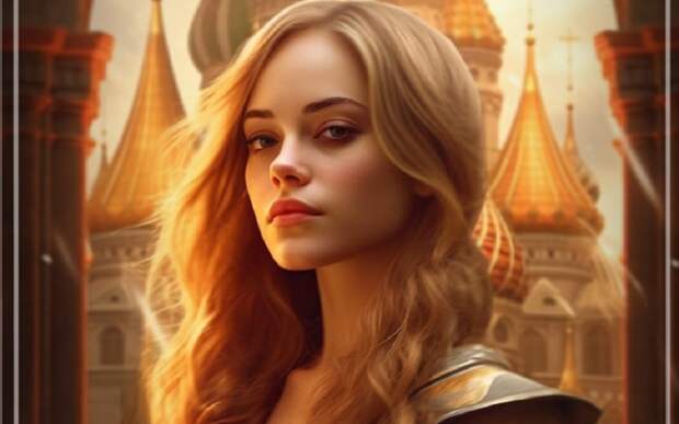 Нейросеть Mafiloda привычно изобразила наш город в виде девушки. Молодая блондинка с распущенными волосами одета в платье с элементами, стилизованными под средневековье. За ее спиной - храм с золотыми куполами, по форме напоминающими пламя свечи. Подпись гласит, что Рязань славится храмами и памятниками.