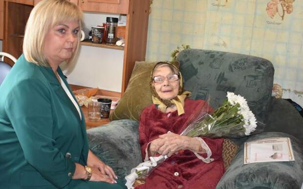 Поздравить именинницу пришли местные власти. Юбилярше вручили цветы, подарки и поздравление от президента.