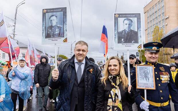 В Рязани к торжественному шествию присоединились и представители региональной и городской власти. В строю «Бессмертного полка» можно было заметить губернатора Николая Любимова с женой. Они несли портреты дедов: Алексея Никитина и Ивана Кузьмина.