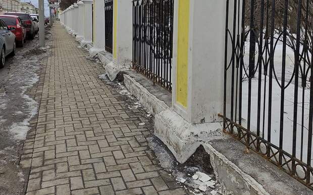 "Новый заборчик разваливаться стал - и года не прошло", - прокомментировала автор снимка. Судя по фото, наибольший ущерб понесла нижняя часть ограды. Отделка отвалилась в нескольких местах.