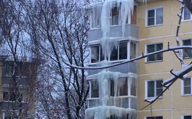 Снимок сделан на Островского, 39. Видно, что замёрзшая вода ледяным каскадом спускается вдоль балконов на протяжении четырёх этажей.