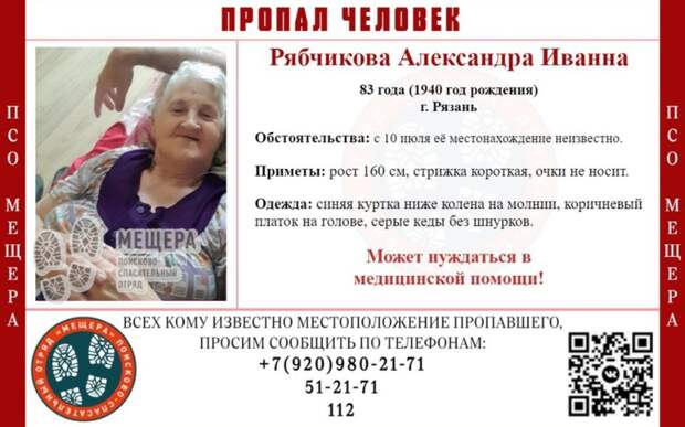 Женщина нуждается в медпомощи. Граждан, обладающих какой-либо информацией о местонахождении пенсионерки, просят сообщить по телефонам, указанным в ориентировке.