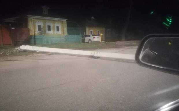 На кадрах — упавшая мачта электроосвещения и сильно повреждённый кроссовер. У автомобиля отлетело зеркало бокового видения, видны вмятины на правой стороне машины.