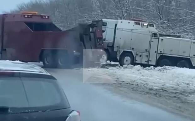 На кадрах видно, что большегруз вылетел в кювет, его пытается вытащить спецтехника.