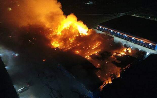 Уточняется, что пожар начался на складе с электроникой. Одной из возможных причин пожара называют аварийную работу электросети и неосторожное общение с огнём.