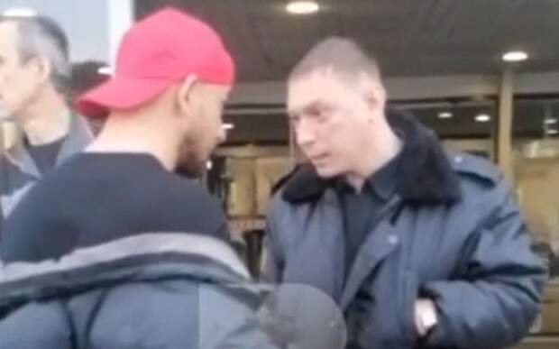 На кадрах видно, что охранник не пропускает мужчину внутрь ТЦ при этом нецензурно выражается.