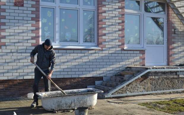В учреждении ремонтируют игровые площадки на улице, песочницы, горки, карусели, прогулочные веранды и входные группы.