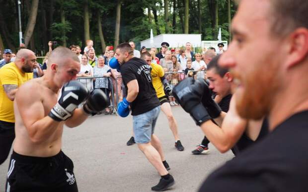 Две команды в чёрных и жёлтых майках сошлись на площадке перед Зелёным театром. Среди участников — представители спортклубов и общественных организаций. На площадку пускали только экипированных бойцов в перчатках. Бой продлился минуту, в нём были исключены захваты, бить можно было только по верхней части туловища и только руками.