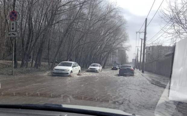 На кадрах можно видеть, как машинам приходится пробираться сквозь затопленную дорогу. Пешеходная дорожка при этом пока ещё вне воды и свободна для прохода.