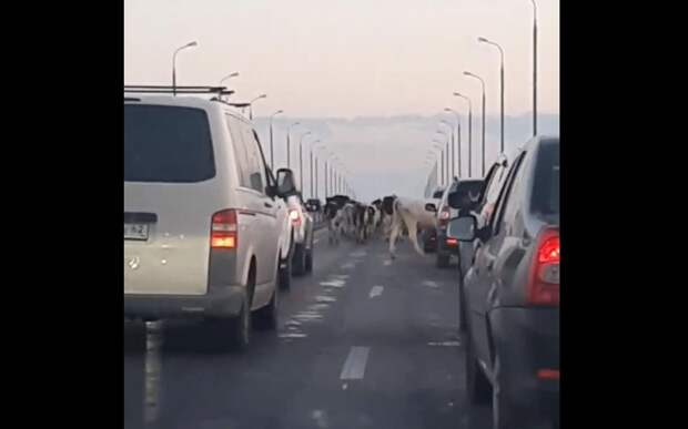 На кадрах можно заметить, что из-за животных автомобилистам приходится ехать медленно. Коровы шли прямо среди машин.