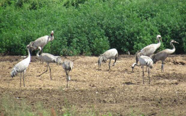 На снимках можно заметить около 17 журавлей, которые пока держатся подальше от людей.