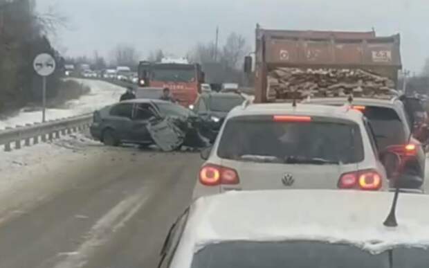Машина получила сильные механические повреждения. На месте аварии образовалась большая пробка, так как легковушка встала поперёк дороги. На месте работают экстренные службы.
