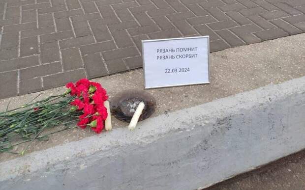Первые гвоздики и свечи в память жертв теракта появились рядом со зданием Муниципального культурного центра на площади Победы ранним утром 23 марта. На табличке рядом - дата теракта и слова "Рязань помнит. Рязань скорбит".