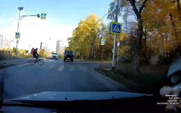 На кадрах видно, как мужчина в служебной униформе движется по пешеходной дорожке вдоль проезжей части, а затем сразу, не осматриваясь и не спешившись с велосипеда, выруливает на пешеходный переход. Водитель, с чьей машины велась съёмка, успел среагировать и не допустить аварии.