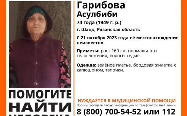 Приметы: рост 160 см, телосложение нормальное, волосы седые. Была одета в зелёное платье, бордовую жилетку с капюшоном и тапочки.