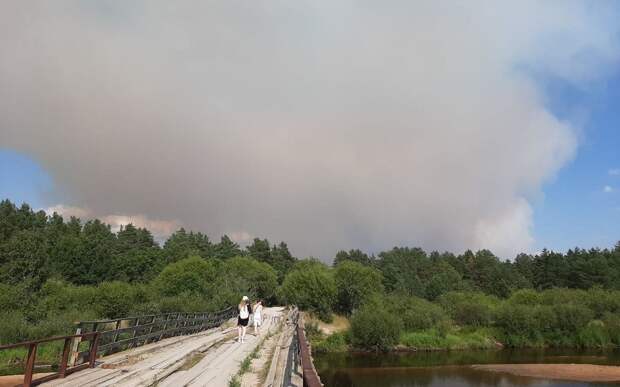 "За рекой в районе Кудома лесной пожар, сильно лес горит, большое облако дыма над деревней и запах гари", - пишет автор поста.