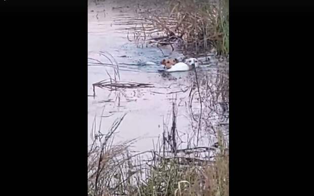 Видеороликом поделилась Олеся Костина. На кадрах видно, как две охотничьих собаки породы джек-рассел-терьер тащат из воды подстреленную утку.