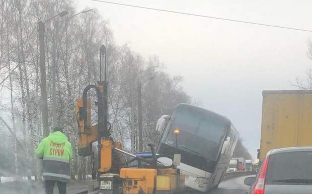 Автобус повис на ограждении возле съезда на Михайловское шоссе. По словам автора, пробка образовалась в обе стороны.