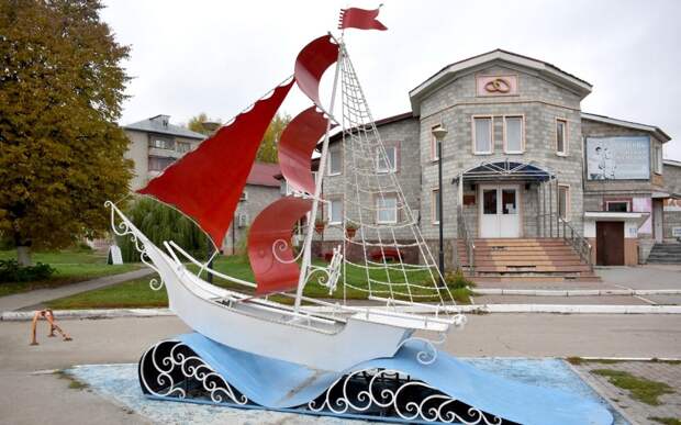 Возле детской библиотеки появился могучий дуб со златой цепью и котом, в детском саду №5 – грибок, мишка и колобок в окружении божьих коровок и бабочек. Недавно мастер создал работы из металла. Рядом с ЗАГСом появился корабль с алыми парусами, а с детской школой искусств – белый рояль.