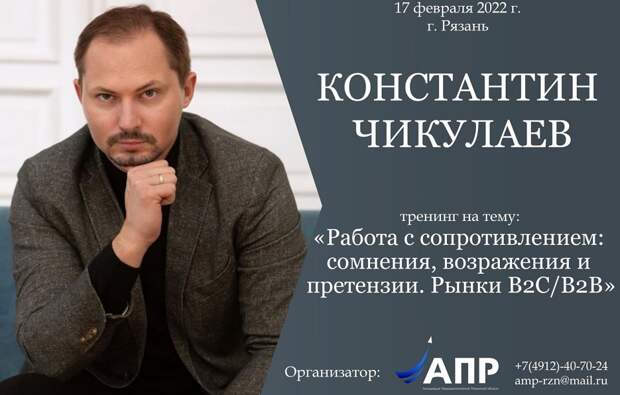 Спикером выступит Константин Чикулаев – бизнес-тренер, на постоянной основе работает с международными компаниями: Rehau, Peugeot Citroen, Fiat, Chrysler, Legrand and etc. Обучил свыше 20000 человек в 7 странах мира. Цель тренинга: изучить и отработать на практике техники и приемы работы в ситуациях, когда покупатель оказывает сопротивление