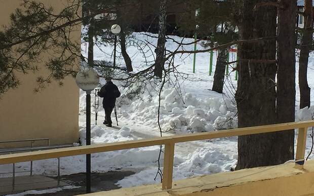 Администратор выходит к дверям, спрашивает у людей, как дела, напоминает, чтобы одевались теплее — в феврале у нас прохладно: «Я же сама бабушка. Они меня уж все знают. Хвалят всё, гуляют с удовольствием… Лес вот у нас какой».