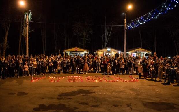 Помню снесённый после бомбежки угол общежития, помню полностью набитое людьми бомбоубежище, где светила тусклая лампочка».В конце встречи участники выложили из горящих свечей слово «Победа».