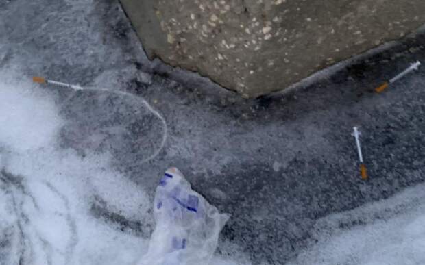 На кадрах видны несколько шприцов у большого камня во дворе спорткомплекса. Некоторые успели вмёрзнуть в лёд.