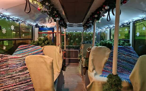 Пассажиры теперь чувствуют русский колорит - троллейбус внутри больше напоминает зал краеведческого музея. Сундуки, керосиновые лампы, лапти, тележные колеса, самотканные коврики и мешковина на сиденьях - поездка превращается в путешествие в прошлое.