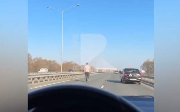 Кадры появились в соцсети в среду, 10 апреля. На них видно, как неизвестный мужчина идёт по дороге по левой полосе. При этом мужчина шёл посередине полосы.