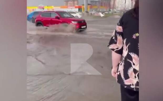 «Люди переходят дорогу вплавь», - пишет автор ролика. На кадрах видно, что проезжая часть и частично пешеходная дорожка подтопило водой.