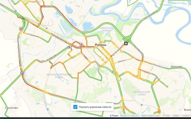 Медленно едет транспорт на Московском шоссе, Первомайском проспекте как в сторону центра, так и в сторону выезда из города. Автомобильные пробки на Южной окружной дороге, Муромском шоссе, небольшие заторы в Дашково-Песочне – улице Новосёлов, Советской Армии, Касимовском шоссе (в направлении ТЦ «Глобус»).