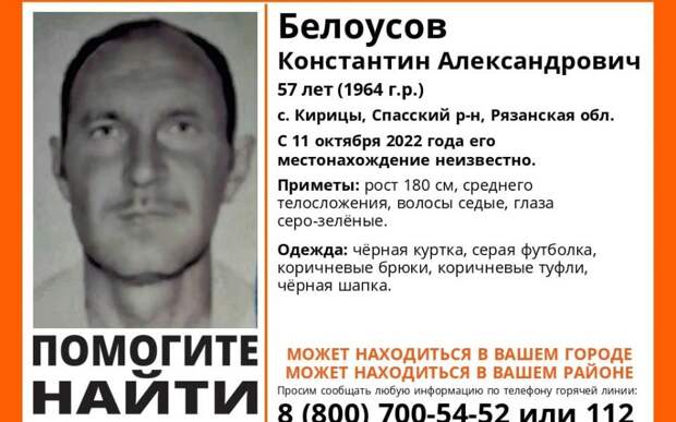Местонахождение мужчины неизвестно с 11 октября. Указывается, что он проживал в селе Кирицы Спасского района, но может быть в городе или в каком-то из районов Рязанской области.