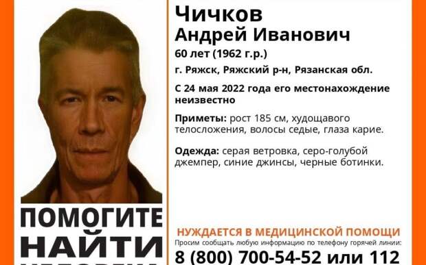 Сообщается, что он числится пропавшим с 24 мая. Рост — 182 сантиметра, телосложение худощавое, волосы седые, а глаза карие.