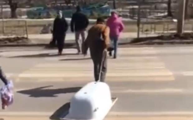 На кадрах можно заметить мужчину, который переходит дорогу и тянет за собой на верёвке ванну.