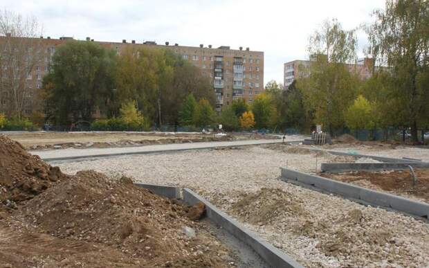 В настоящее время устанавливаются бордюры, производится отсыпка основания будущей площадки щебнем. Подрядчик работает каждый день без выходных.
