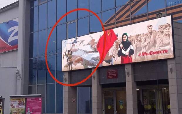 Сам плакат появился на здании МКЦ на площади Победы в апреле. На нём изображена украинская бабушка, ставшая символом после встречи с военными ВСУ. Она приняла их за россиян и вышла встречать с благодарностью и красным знаменем. Те предложили ей еду, открыли свою принадлежность и начали топтать знамя.