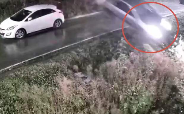 Судя по кадрам, водитель съехал с дороги – автомобиль пролетел несколько метров прямо над припаркованной машиной и врезался в здание.