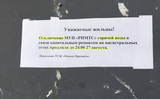Так, например, в доме №20 на Бустрецкой воду планово отключили с 1 до 14 августа. Однако в день, когда должны были возобновить горячее водоснабжение, жильцов известили, что сроки сдвигаются до 19 августа и могут быть продлены еще. Так и получилось - 19 августа на подъездах красовались объявления о продлении отключения до 27 августа.