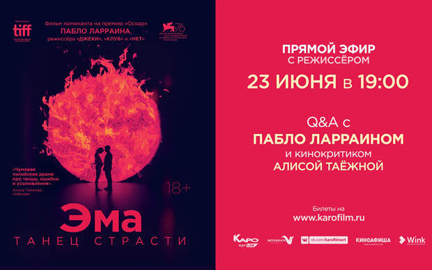 Сразу после показа фильма в 20:50 в прямом эфире состоится онлайн-встреча c режиссером Пабло Ларраином, обладателем призов Каннского, Венецианского, Берлинского и других кинофестивалей. Зрители смогут задать свои вопросы онлайн, оставляя комментарии под LIVE-трансляцией встречи, которая будет доступна в официальном сообществе проекта КАРО.Арт в социальной сети «ВКонтакте». Модератором беседы будет кинокритик Алиса Таежная.