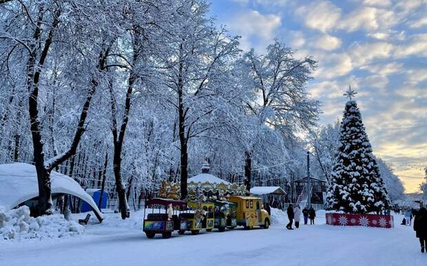 Лесопарк напоминает сейчас новогоднюю открытку - заснеженные деревья, золотые шары на ветках, нарядная елка.
