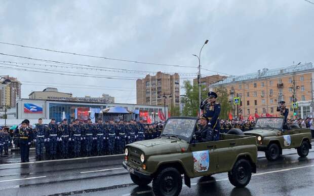 Погода выдалась дождливой, но ничто не может помешать торжествам. На площади Победы в парадном строю выстроились участники шествия.