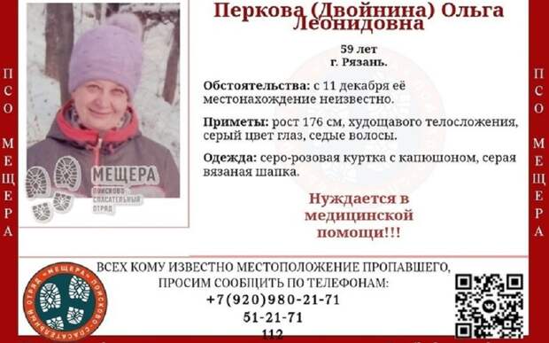 Ольга Леонидовна Перкова (Двойнина) нуждается в помощи врачей, поэтому важно оперативно найти женщину. пропавшей - 59 лет. Она достаточно высокая - 176 см, худощавая. Особых примет нет, сероглазая, седая. 11 декабря на ней была серо-розовая куртка, на голове - серая шапка.