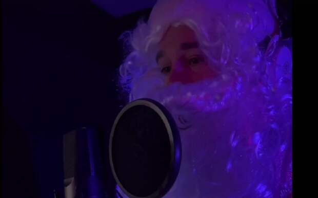 На видео показано, как Дедушка Мороз приходит в гости к мужчине, и они вместе идут в студию.