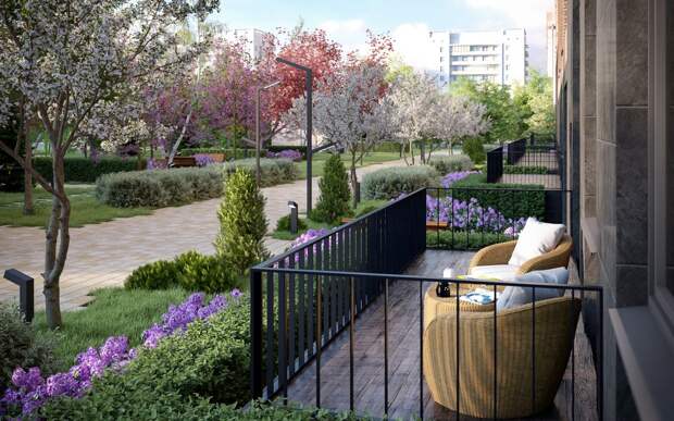Ландшафтный дизайн парка разработан по концепции «четыре сезона»: весной это цветущие яблони и вишни, летом – липы, осенью - ярко-пурпурные листья голландских клёнов Royal red, зимой - вечнозелёные ели и пихты. Парк оформлен взрослыми деревьями, чтобы жители комплекса могли сразу насладиться парком.
